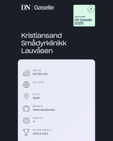 Vi er stolte over å kunne kunngjøre at Kristiansand Smådyrklinikk også i år har blitt utnevnt som Gaselle-bedrift av Dagens Næringsliv – for både 2024 og 2025!